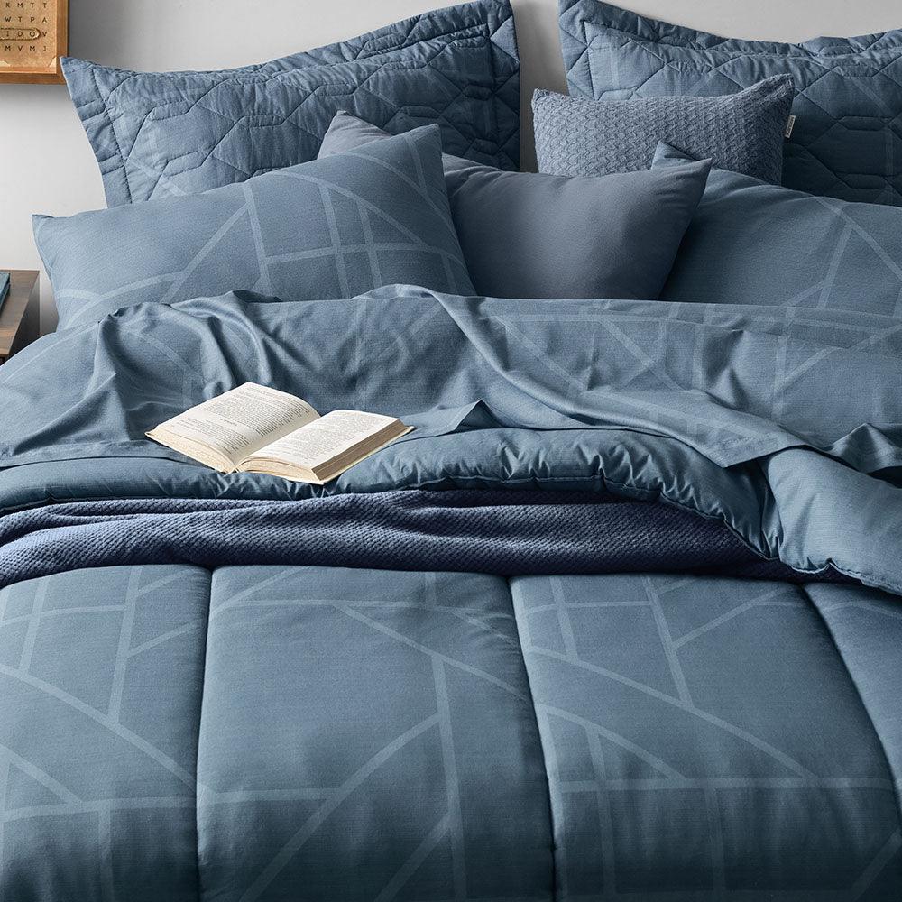 O Jogo de Cama Isac tem estilo moderno e minimalista que combina com os mais variados gostos, com um azul lindo e desenhos geométricos.